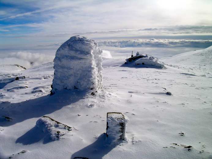 Auf der Straße (oder eine Kehre abkürzen) im Wald zu einer Kurve auf 1.470 m (Wegweiser, Bergrettungshäuschen mit Schlitten). Dort genau nach Süden kaum ansteigend durch den romantischen Nadelwald (gelbe Markierung je nach Schneelage an den Bäumen mitunter nicht gut sichtbar). Über einige Lichtungen zu derjenigen mit dem Fleischer-Gedenkstein.