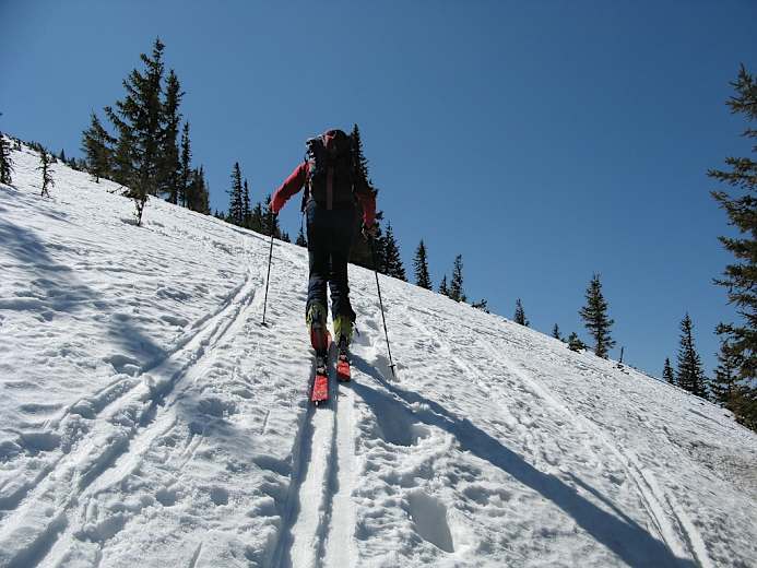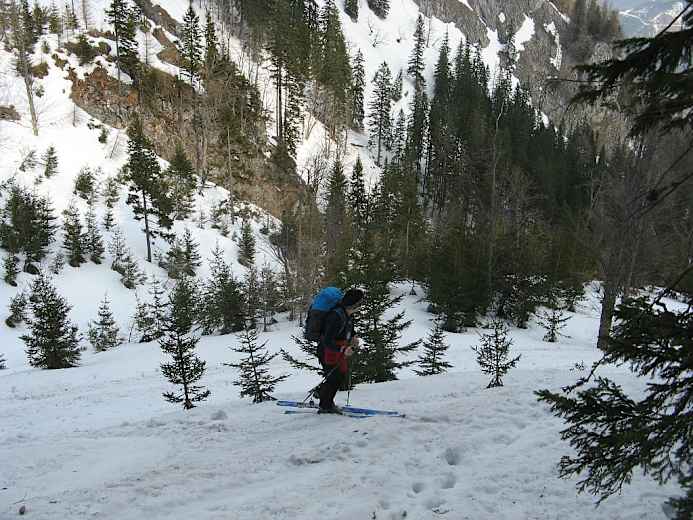 Dann ein Flachstück und ab einer Linkskurve flotte Fellabfahrt auf dem Fahrweg zur Einmündung in eine Forststraße, 1.250 m. Ab hier der gelben Markierung folgend sanft ansteigende Querung unter den Fadenwänden, stellenweise ist höchste Vorsicht geboten.