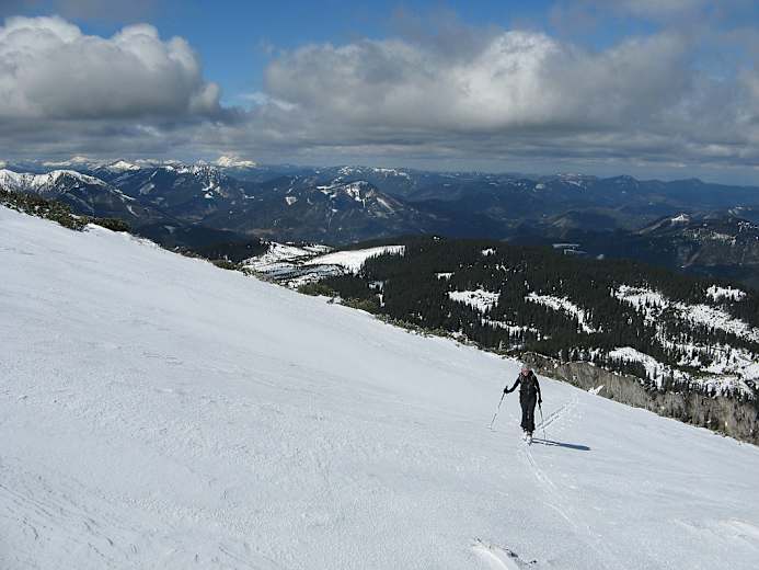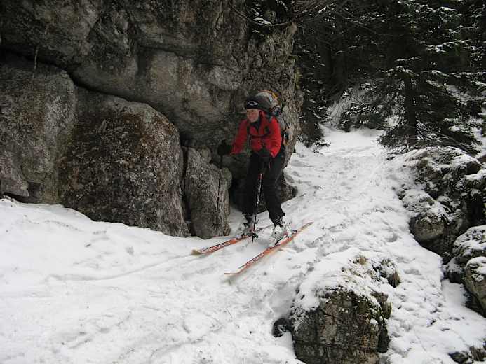 Wie Aufstieg. In einem der drei Äste des Hoyosgrabens bis 1.520 m, dann entweder links in den Wald oder weiter bis zu einer Engstelle, die bei guter Schneelage befahren werden kann.