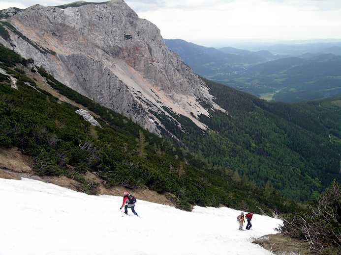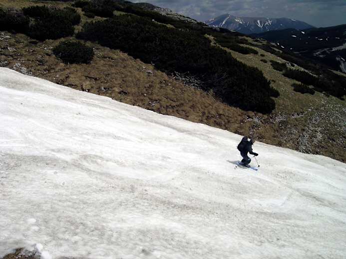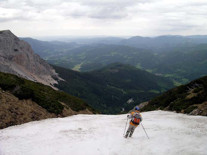 Sehr beliebte kurze Skitour in einer im Frühjahr lange schneegefüllten Rinne in der Rax-Schneeberg-Gruppe. Sie bietet bis in den Mai hinein Schnee.