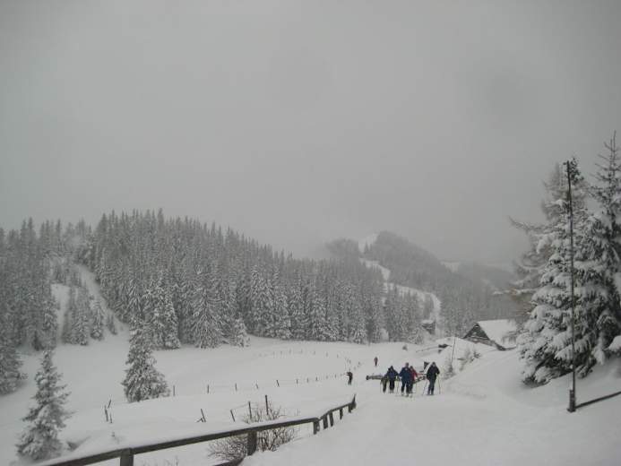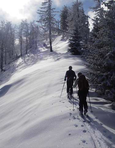 Vom Parkplatz an der Talstation des ehemaligen Sessellifts rechts entlang und auf schmalem Streifen zum unteren Rand der Piste. Auf dieser nach Süden zu einer querenden Forststraße, 1.030 m. Nun weiter auf der Piste in einer großzügigen Diagonale, dann mit einigen Richtungsänderungen zu einem Absatz, 1.390 m.