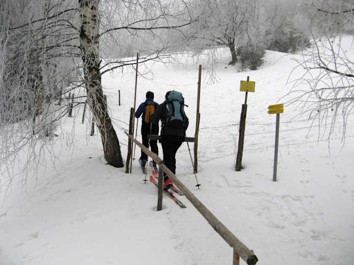 Vom Parkplatz die Ski entweder kurz steil auf der Straße bis zur Wiese tragen oder bei ausreichendem und nicht gestreutem Untergrund angeschnallt starten.