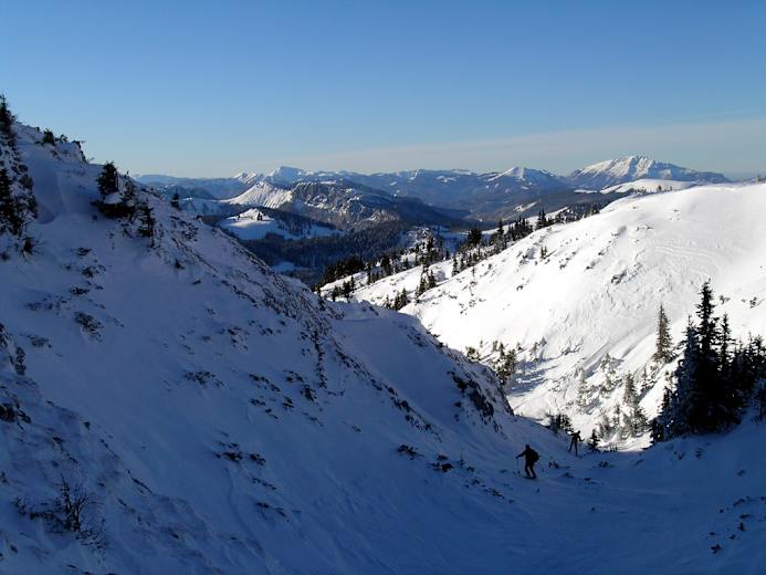 Im Allgemeinen wie Aufstieg. Zu Beginn schöner in der seichten Mulde nördlich neben dem Aufstiegsrücken dahin, dann einige landschaftlich reizvolle Windungen. Die Mulde mutiert zum engeren Graben und dreht nach W ein. Vor einem Abbruch links oder rechts ausweichen und weitere genussvolle Abfahrt über die Ramleiten.