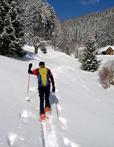 Weiter über den lichten, zunehmend steilen Waldrücken nach NW (Weg Nr. 465). Dann in der baumfreien Flanke in zahlreichen Spitzkehren (keine Scheu vor Harscheisen!) höher, zuletzt etwas links ausholend auf's Plateau (nicht rechts zur Stütze der Materialseilbahn) und in Kürze rechts zum erst jetzt sichtbaren Graf-Meran-Haus. 2 Std.