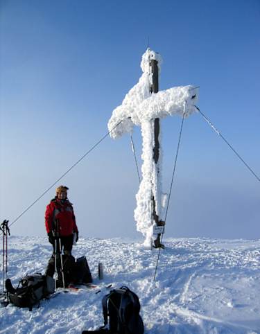 Von der Hütte genau nach NW über einen breiten Rücken zum Gipfelkamm und rechts in Kürze zum weithin sichtbaren großen Kreuz. ½ Std.