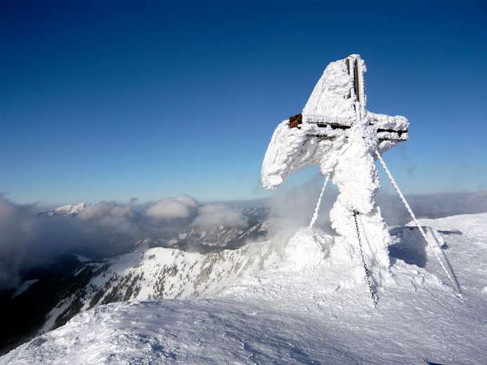 Das oft stark rauhreifüberzogene Gipfelkreuz auf der Hohen Veitsch, hinten links der Ötscher Foto: Berg&Karte