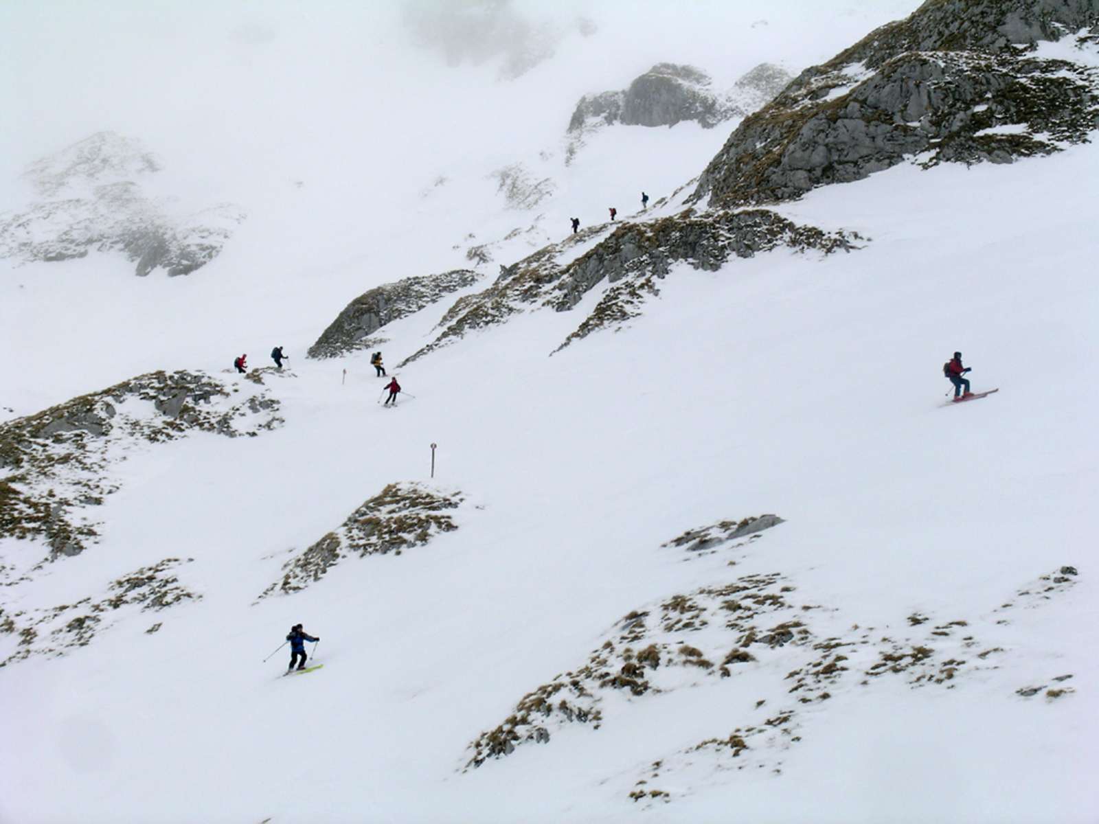 Weiter durch einen seichten Graben, dann über schöne lichte Waldböden und durch eine Mulde (Verwechtungen) in den Sattel des Höllkampls, 1.449 m. Jenseits sanfte 50 hm Fellabfahrt in einen weiten Boden. Über die Lichtung, dann im Wald sanft ansteigen und durch die Voisthalergasse steiler aufwärts. 1,25 Std.