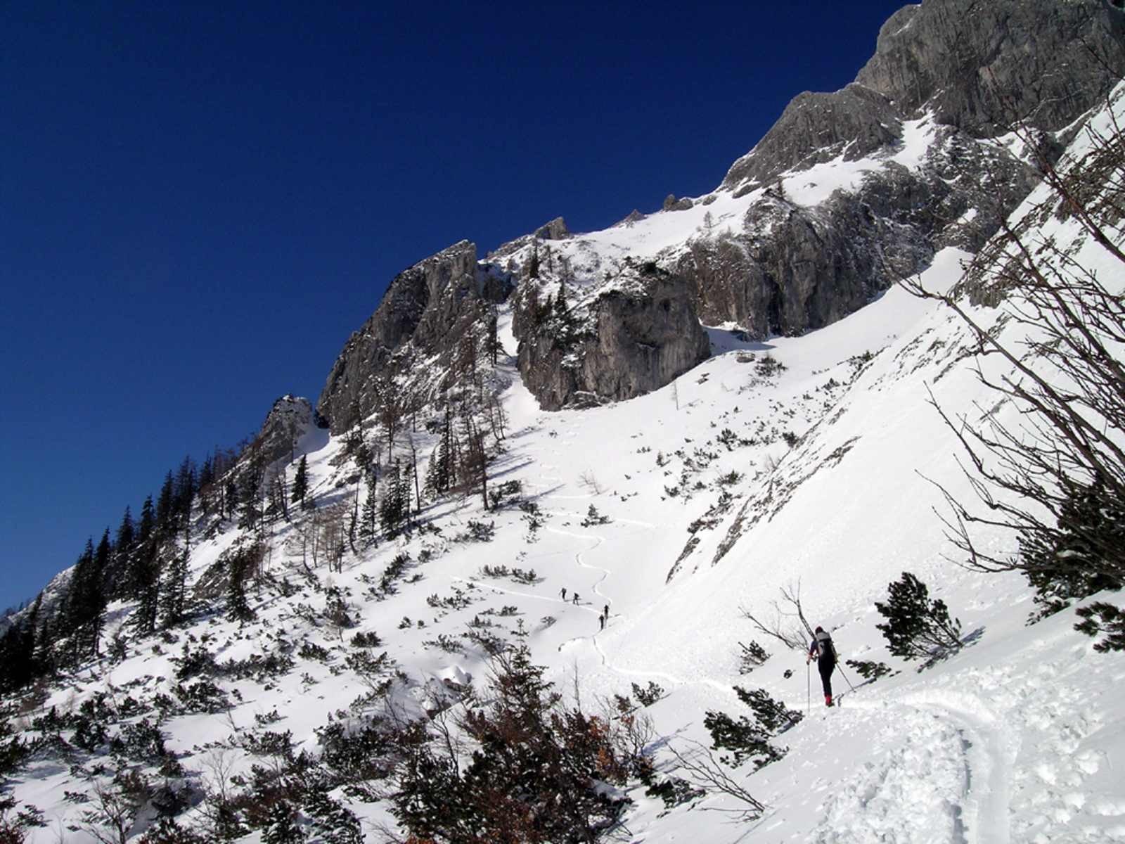 Vom Gasthof Bodenbauer über die ebene Lichtung talein und am Waldrand bei der Gabelung rechts Richtung Schiestlhaus (Weg Nr. 839). Zunächst flach auf der Forststraße, bei Pkt. 961 m über den Trawiesbach (Ski event. abschnallen) und auf eine Lichtung unter der Hundswand (Lawinen aus dem Schönbergkar!). Direkt zur Wand und am Wandfuß steil hinauf zu einem Waldrücken. Links über diesen bald flacher hinaus in einen lichten Bereich (Lawinen aus dem Rauchtal!). 1 Std.