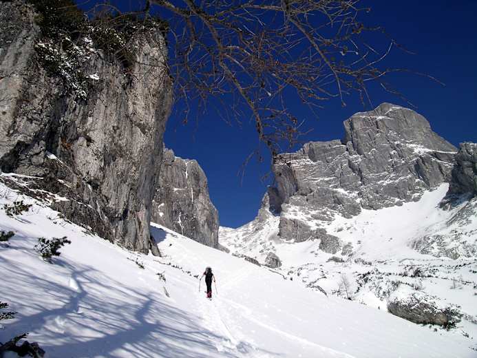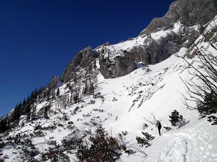 Bei guten Verhältnissen kann man nachher im lichten Wald auch direkt durch den Graben zum Boden unter der Hundswand abfahren und spart sich dadurch die Traverse am Wandfuß.