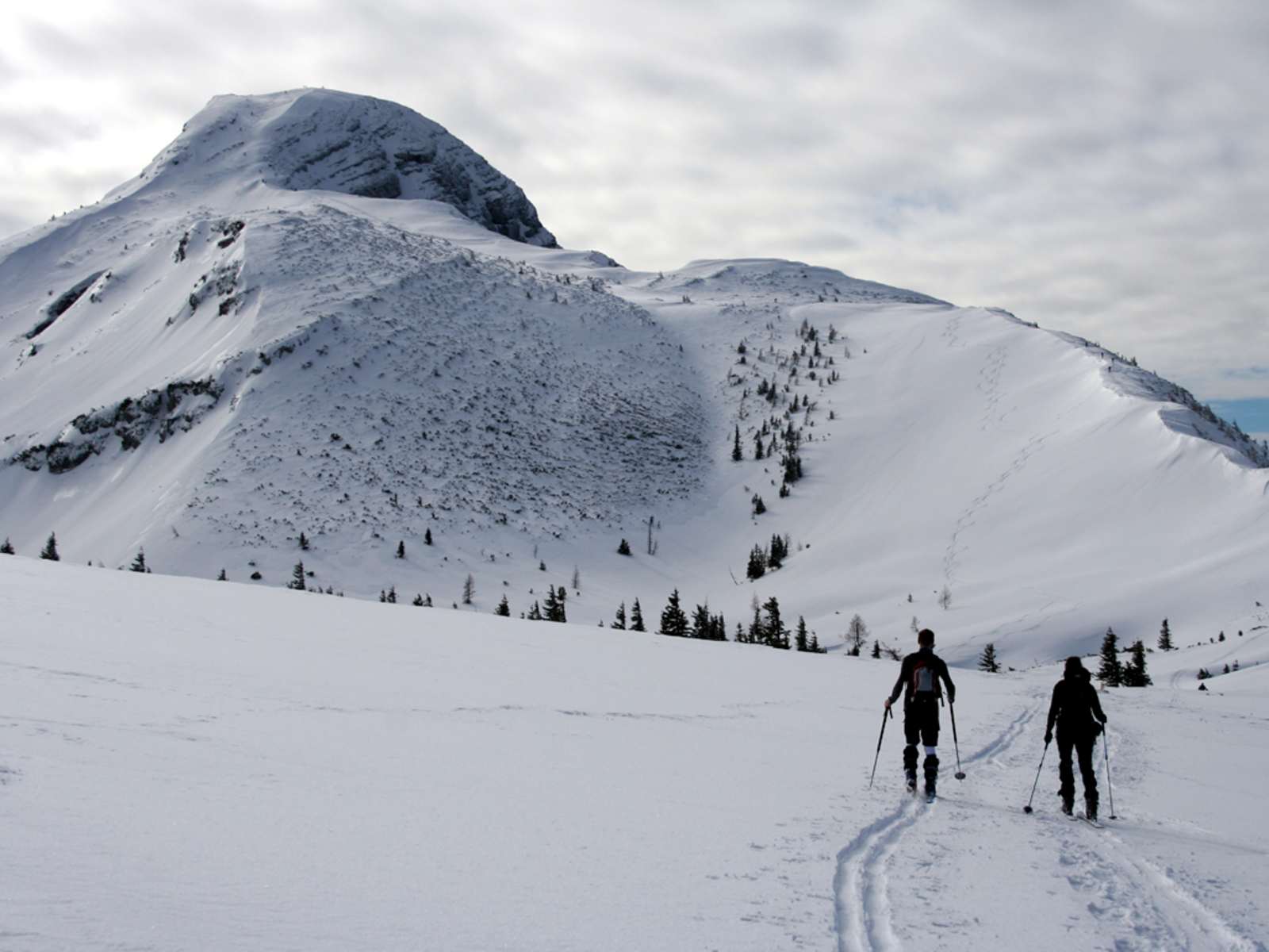 Nach dem steileren Gipfelhang rechts der Aufstiegsspur in eine schöne Mulde bis 1.620 m. Anfellen. Nach N in den weiten Sattel, aus diesen bald rechts abdriften und auf den Graskogel, 1.742 m. Abfellen.