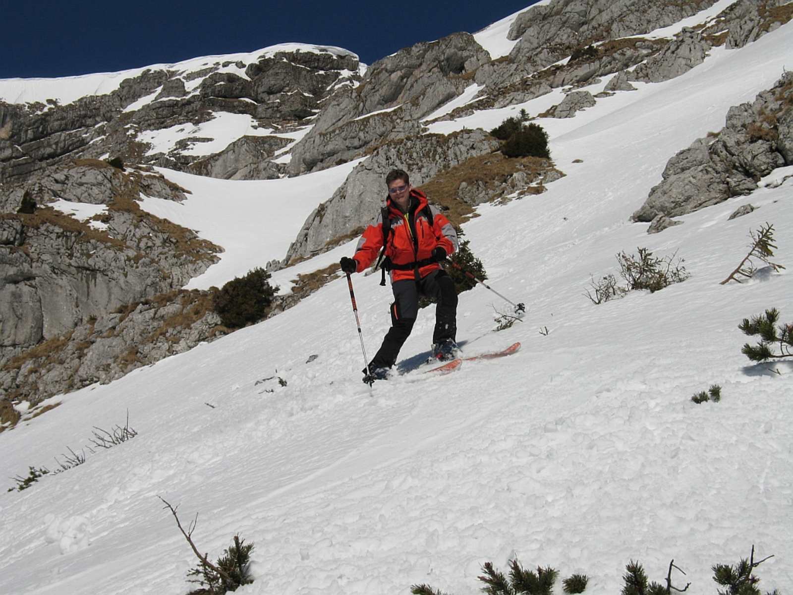 Vom Gipfel nach Osten an der Geländekante (Wechten) entlang, dann ca. auf halbem Weg zu Pkt. 1.888 m nach Süden einfahren in die breite, zunächst mäßig steile Flanke. Anschließend entweder an geeigneter Stelle (Steilrinne) in das darunter sich öffnende Kar, oder (bei heiklen Verhältnissen besser!) weiter über den Rücken, der die Wurzleiten vom Südkar trennt und erst auf 1.600 m in die Wurzleiten. Genussvolle Abfahrt zunächst über die Flanke, dann im anfangs lichten, dann doch recht dichten Buchenwald zur Forststraße auf 1.150 m.