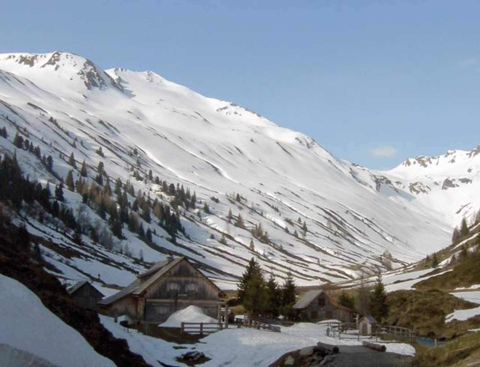 Auf der Mautstraße ins Riedingtal. Die Mautstraße ist zwar erst ab dem Muttertag geöffnet, dies ist aber kein Grund zur Sorge: Schnee ist an den Nordhängen der Jägerspitze um diese Zeit immer in Hülle und Fülle vorhanden - auch wenn im Flachland längst die Bäume blühen. Noch ein Tipp: Fallweise ist die Straße noch ein Stück vor der Königalm von einem mächtigen Lawinenkegel verlegt. Für alle Fälle wäre also die Mitnahme des Bikes eine gute Idee; hat man nämlich das Rad erst einmal über die Reste der von der Nordseite herunterziehenden Lawinenstriche getragen, ist der Weg bis zur Örgenhiasalm so gut wie immer frei befahrbar.