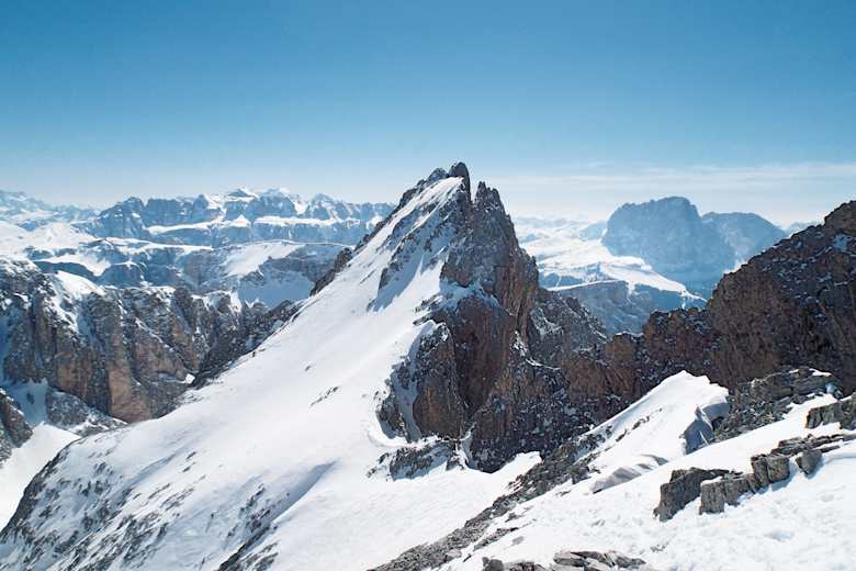 Über eine Felsstufe und den Gipfelgrat erreicht man den höchsten Punkt mit schönem Blick auf die Gipfel der Geisler-Gruppe. Bei dieser technisch anspruchsvollen Skitour sind Pickel und Steigeisen erforderlich.