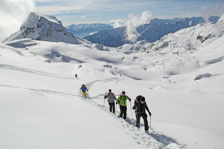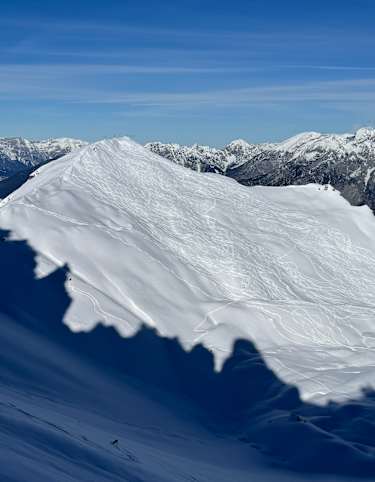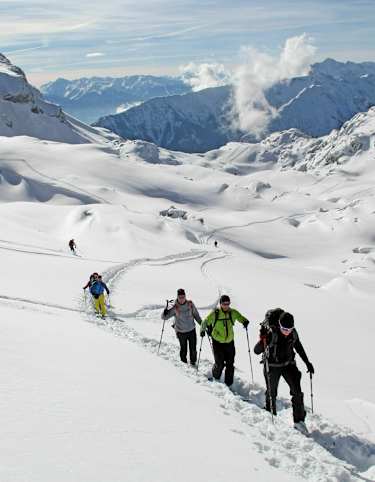 Traumhafte Skitour mit über 1.600 Hm Abfahrt im Tiroler Rofan Gebirge in der Region Achensee: Von der Erfurter Hütte bei der Bergstation der Rofan Seilbahn geht es über die Grubascharte zur Rofanspitze auf 2.259 m. Danach folgt eine grandiose Abfahrt über die Scherbenstein- und die Alpigalm zur Ortschaft Wiesing. Mit einer Abfahrt die rund dreimal so lang ist als der Anstieg, garantiert diese Skitour puren Abfahrtsspaß.