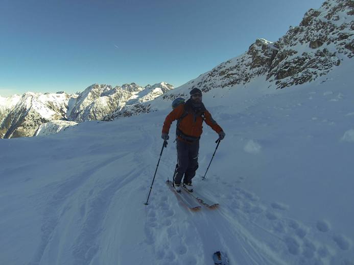 Bei guten Verhältnissen ist die Abfahrt westseitig vom Sattele rechtshaltend am Schafkarsee vorbei möglich.