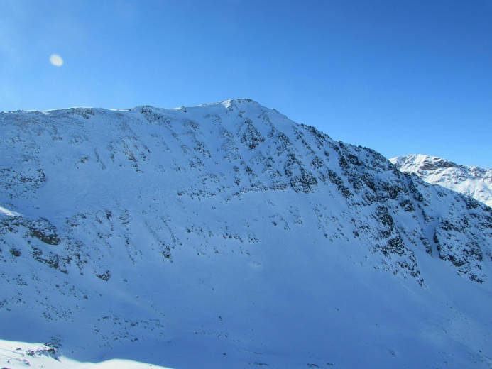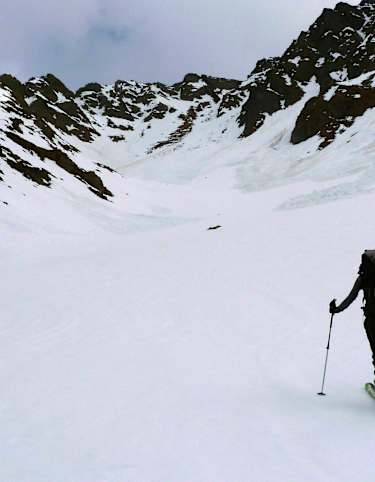 Vom Irecek hat man mehrere Möglichkeiten der Abfahrt: Zum einen über den Grat retour und dann vom flachen Plateau steil in die Senke abfahren, wobei hier schmale Couloirs oft den besten Schnee haben. Oder man sucht sich eine Linie direkt vom Gipfel gegen Norden. Hier müssen die Lawinenverhältnisse passen, da der Hang lang und die Steilheit über 35° beträgt. Die Linien verlaufen zwischen Felsrippen, sind aber gut zu fahren.