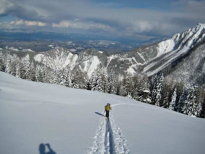 Einfache Skitour in den Kärntner Karawanken auf den Kleinen Frauenkogel (1.754 m). Für den langen Zustieg belohnt man sich selbst mit herrlichen Schwüngen auf den schönen und weiten Almwiesen unterhalb des Gipfels.