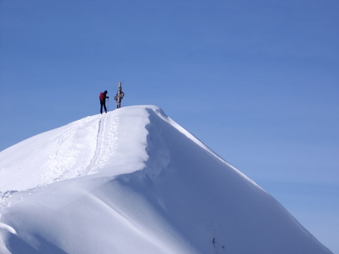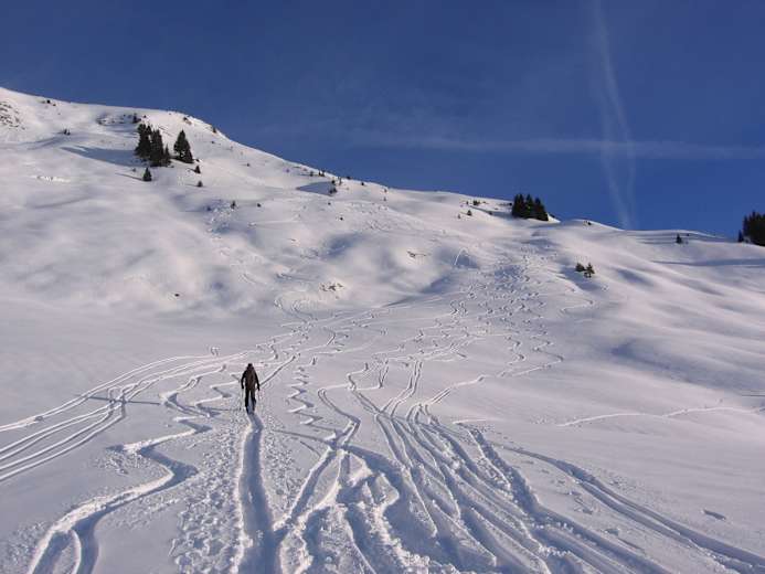 Die Skitour von Faschina aufs Zafernhorn (2.107 m) im Bregenzerwaldgebirge von Vorarlberg bietet mit ihren freien, sanften Hängen bestes Übungsgelände für Skitourenanfänger. Der tolle 360-Grad-Rundumblick vom Gipfel belohnt mit einem schönen Überblick über die Bergwelt des Großen Walsertals und der Region Damüls.