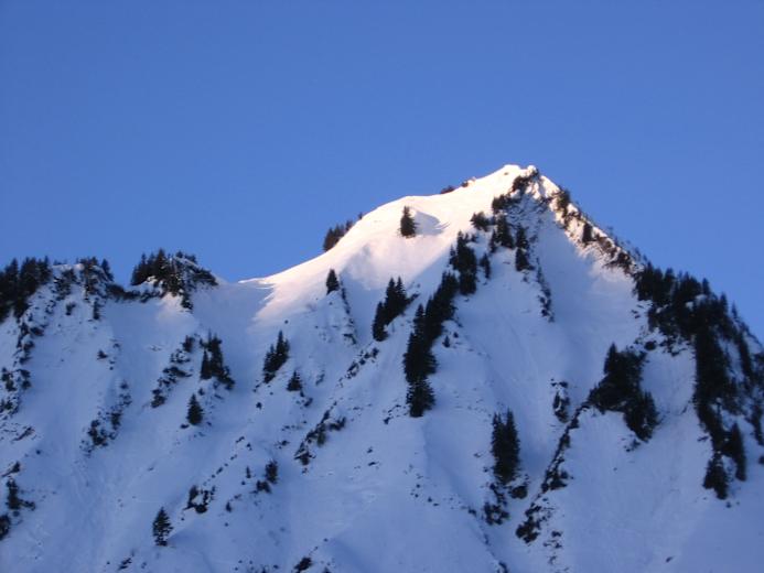 Die Abfahrt direkt über den Südhang ist verlockend und ist in den meisten Fällen auch die besten Option. Bei nicht sicheren Verhältnissen besser über die Aufstiegsroute abfahren.