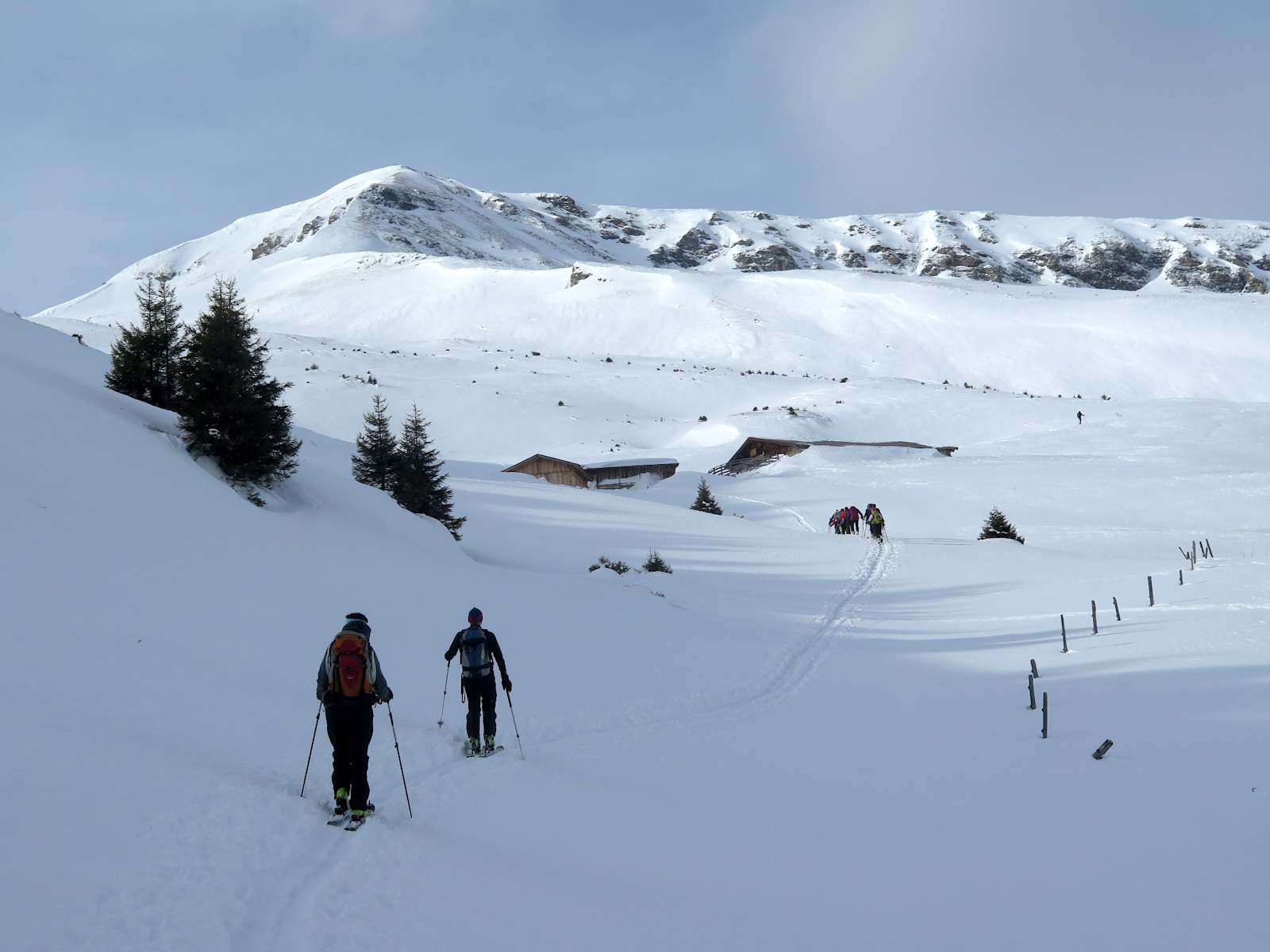 Die Abfahrt geht bei sicheren Schneeverhältnissen auch direkt durch den O-Hang des Schwalbenkars. Weiter über die offenen Wiesenhänge hinunter zum Laffenbach, der bei einer Brücke überquert wird und dann entlang des Forstweges bis zur Skipiste und zurück zum Parkplatz.