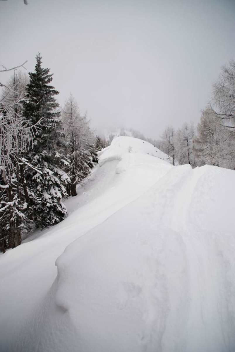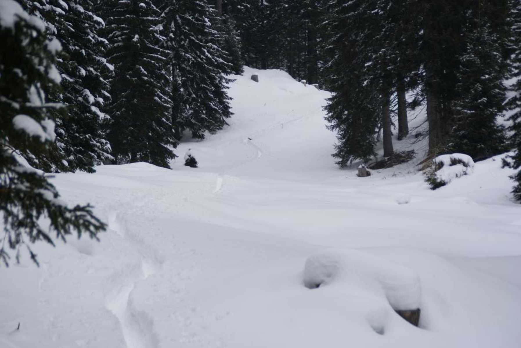 Der schöne Rücken geht in eine steile Waldflanke über, welche schließlich zum markanten Sagrans-Ostgrat (1.719 m) führt. Über leicht kuppiertes Gelände geht man weiter bis zu einem kurzen Steilaufschwung. Es ist empfehlenswert, hier in die Nordostflanke des Sagran zu wechseln. Man erreicht herrliche freie Hänge über welche man die letzten 100 bis 150 Hm zum Gipfel aufsteigt.