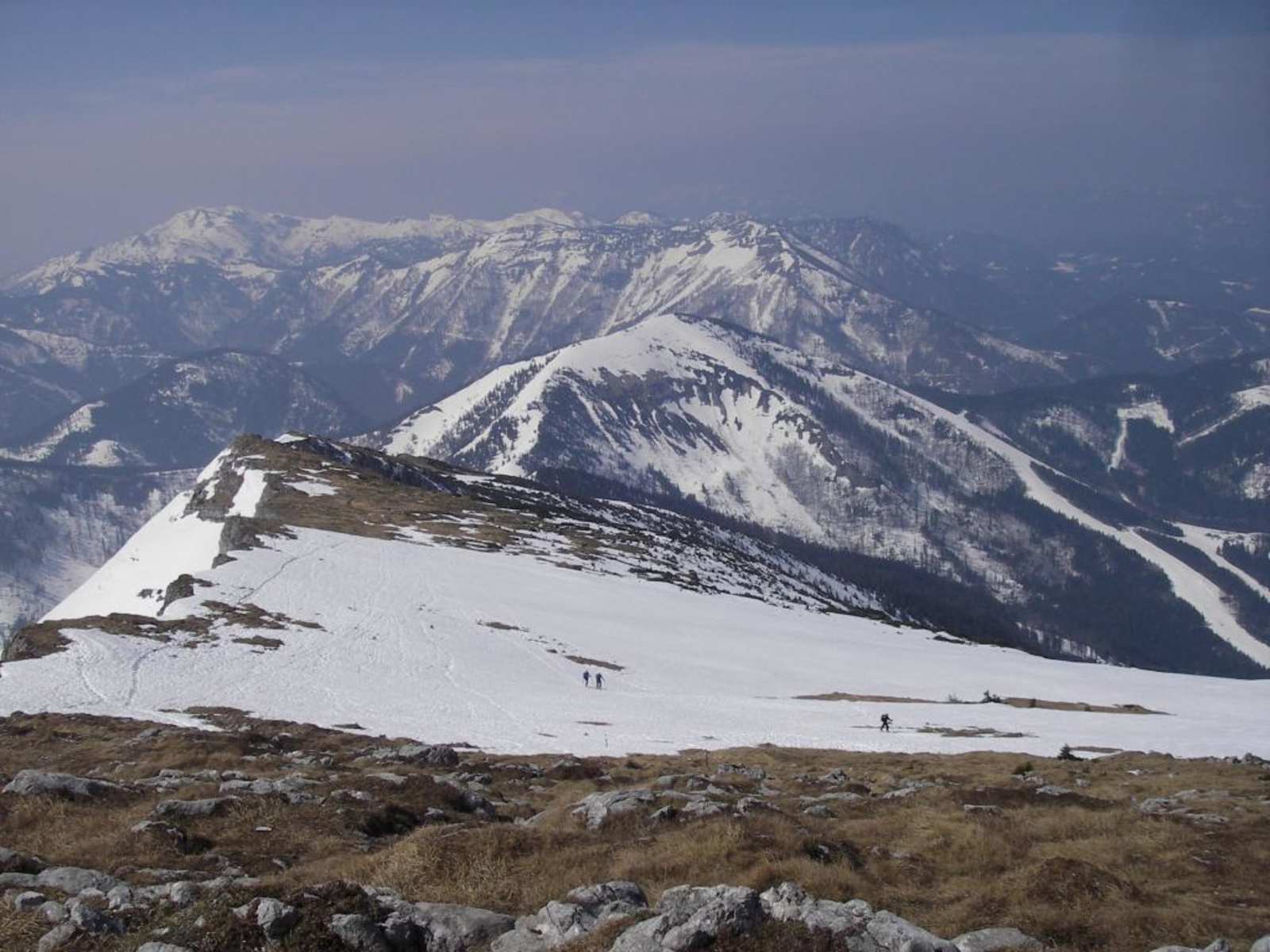 Jetzt ist die Entscheidung zu treffen: Entweder zurück zum Gipfel steil aufsteigen und über die Aufstiegsroute oder eine der Nordrinnen nach Lackenhof zurück abfahren oder rechtshaltend am Waldrand oder im Wald bis auf 1.200 m abfahren, wo man zu einer Forststraße kommt.