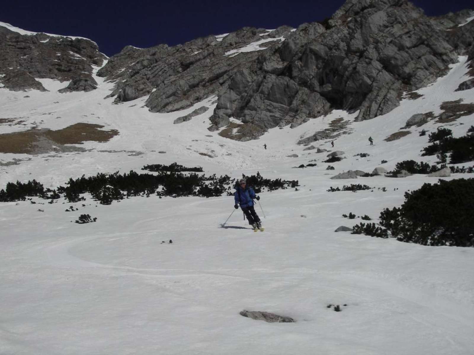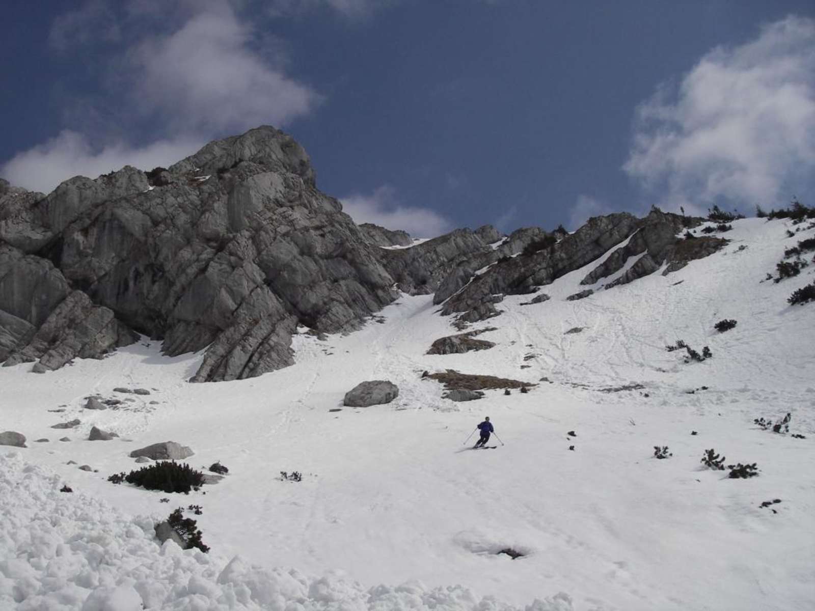 - Einfahrt vom Weissen Mäuerl: steiler! Etwa 500 m westlich vom Gipfel eine Einfahrt suchen und extrem steil nach links ins Südkar einfahren.