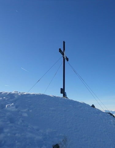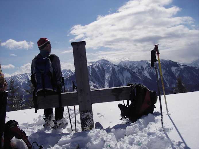 Kurz westwärts, bis links ein freier Hang sichtbar wird, auf dem man bis zum Gipfelkamm aufsteigen kann. In Spitzkehren aufwärts bis zum Kamm auf 1.400 m, dann am flachen Kamm nach rechts bis zum Gipfelkreuz.