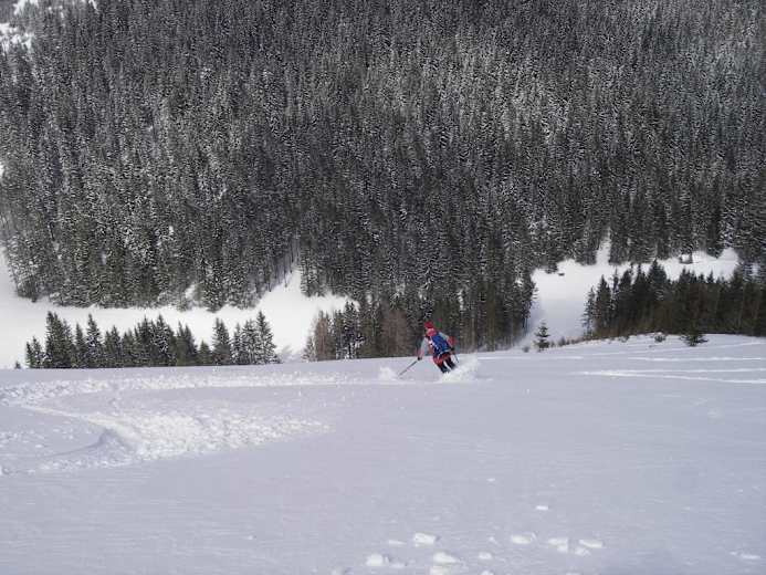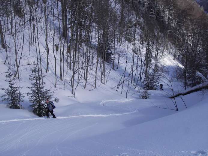 Abfahrt etwa wie Aufstieg. Im Mittelteil (auf etwa 1.130 m) kann man nach rechts queren und schöne Hänge mit Hochwald bis auf etwa 950 m abfahren. Bei sehr guter Schneelage auf einer Forststraße nach rechts und dann direkt zu einer Kehre auf etwa 600 m Seehöhe abfahren. Weitere Abfahrt auf der Forststraße.