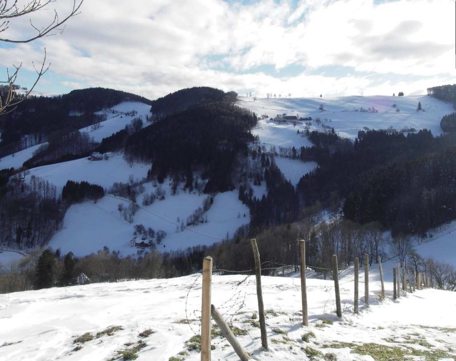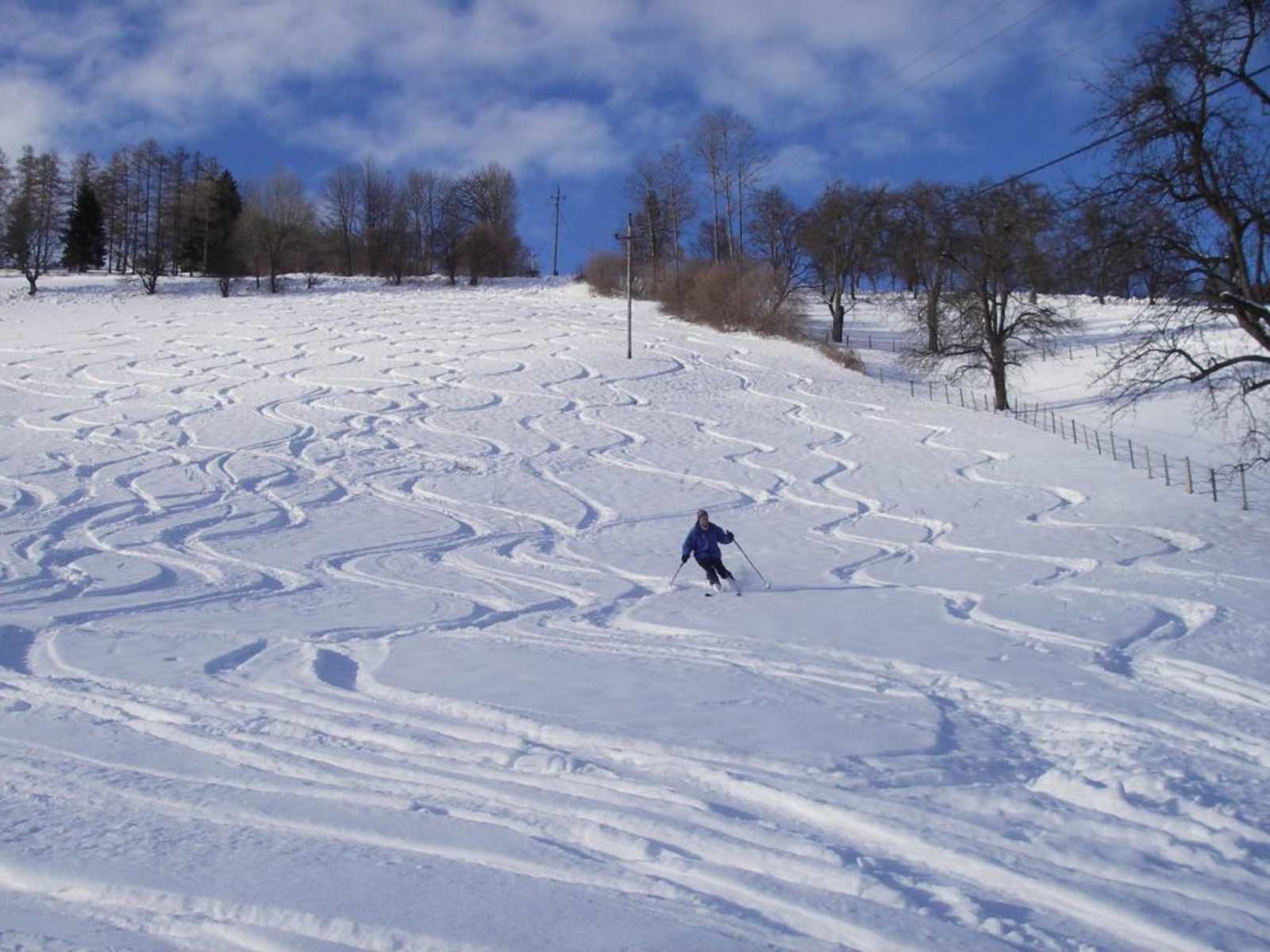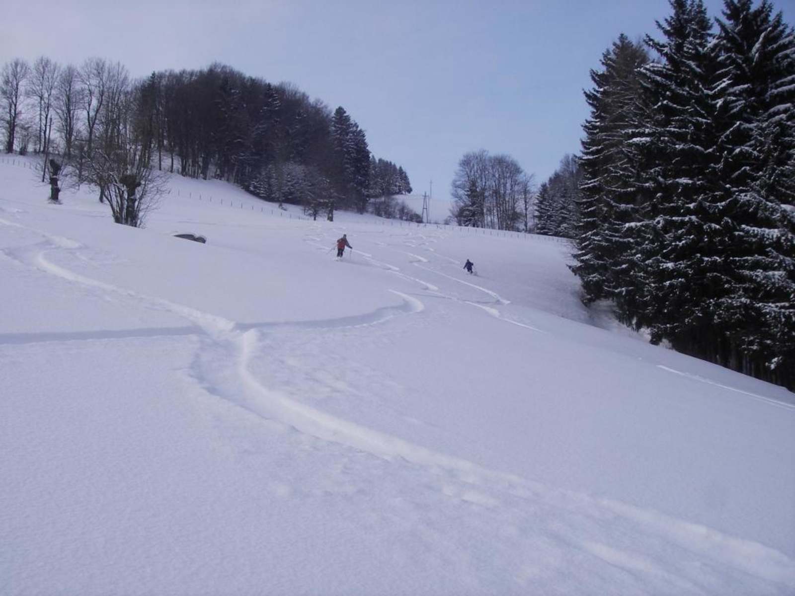 Schöner ist es, vom Vogelsberg am Waldrand ca. 100 Höhenmeter Richtung Süden abzufahren. Beim von links aus dem Wald kommenden Weg anfellen und auf diesem Weg ca. 80 Meter bis zum Kamm aufsteigen. Jetzt zum Mostbrunnen, bzw. zu einem Stadel abfahren. Links vom Gruberkogel leicht fallend zum Bauernhaus und über die freien Wiesen, die wir zu Beginn der Tour aufgestiegen sind, hinunter nach Schliefau.