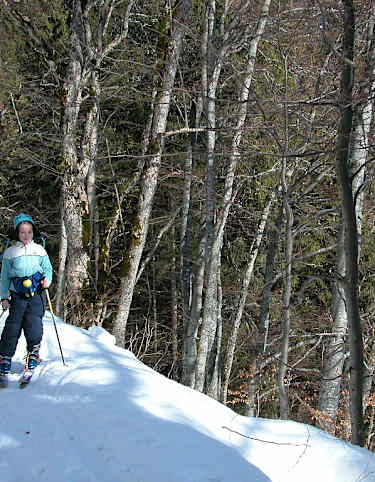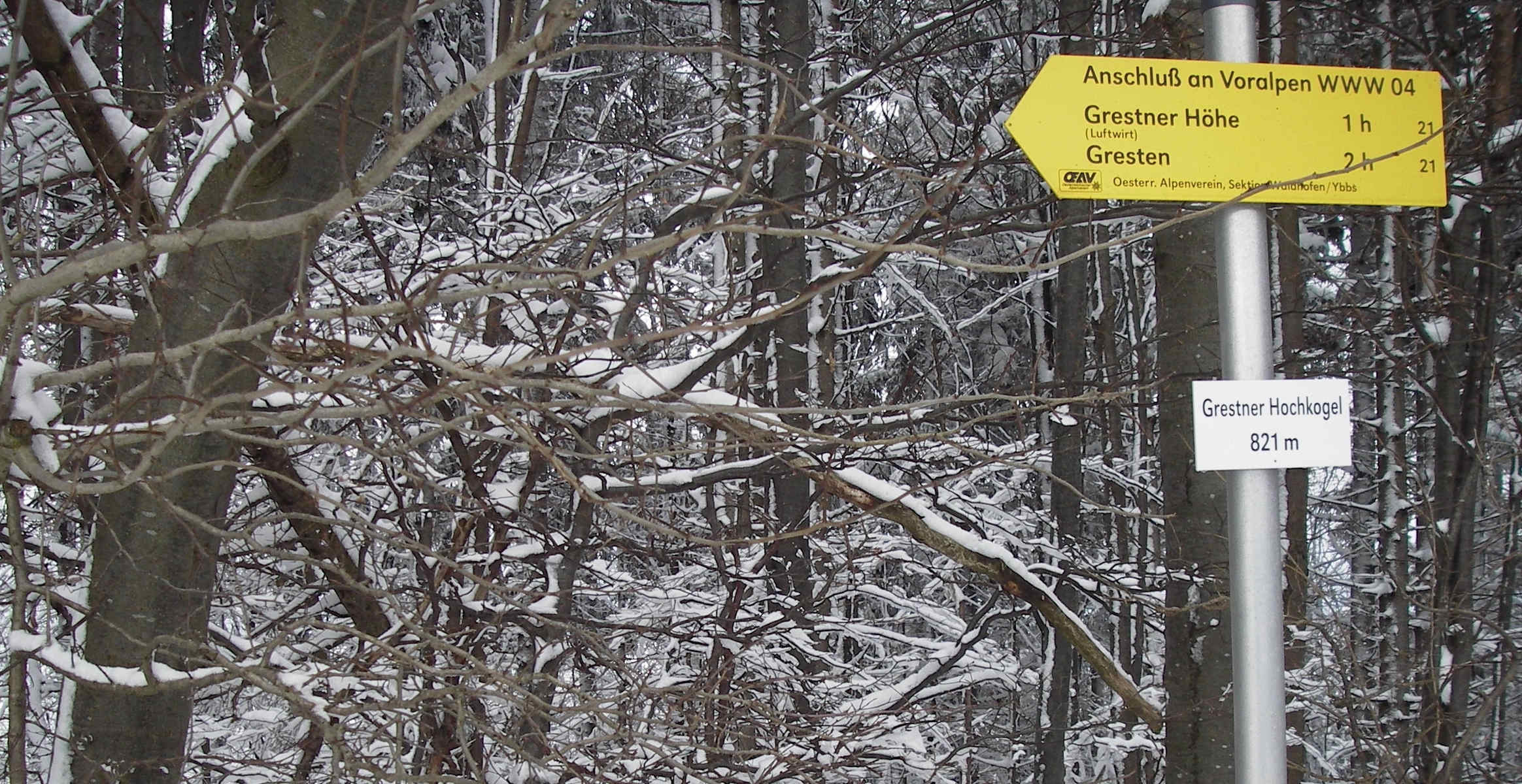 Abfellen und Abfahrt zum Gehöft Aschbichl. Rechts vorbei hinunter zur Straße und eben zur Kreuzung Hinterleiten. Jetzt auf der nach rechts aufwärts führenden Straße 600 m aufsteigen, dann nach links weiter bis man nach weiteren 600 m ein Gehöft mit schöner Aussicht erreicht (bis hierher die Skier eventuell 1,2 km tragen). Auffellen und auf einem Weg nach links (=südwärts) schräg zu einem aufgelassenen Haus weiter. Rechts weiter bis auf den Höhenrücken, wo man einen Weg zum Grestner Hochkogel erreicht, der rechts zum Gipfel führt.