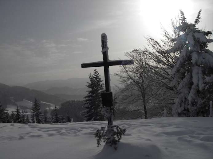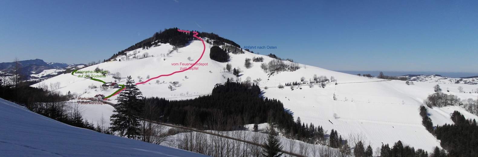 Vom Feuerwehrdepot auf der schräg links (Westen) aufwärts führenden Straße bis zum letzten Bauernhaus. In gleicher Richtung weiter über Wiese, durch Wald zum nächsten Bauernhaus. Weiter westwärts (herrliche Aussicht ins Reichraminger Hintergebirge), dann ostwärts am Kamm über weitere Wiesen und durch Wald auf die Gipfelwiese mit Almhütte und weiter zum Gipfelkreuz.