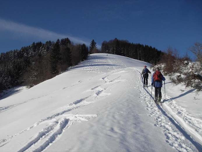 b) ostwärts = am Kamm bis zu einer Straße. Kurz nach links und weiter auf einer schönen Wiese bis zum Waldrand.