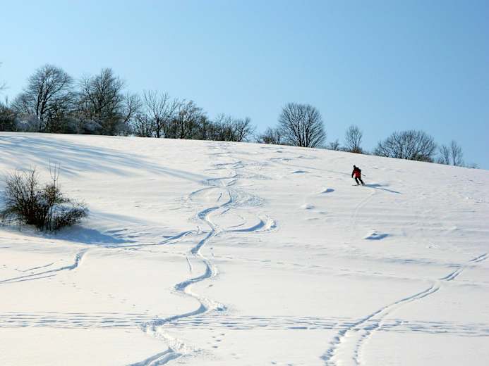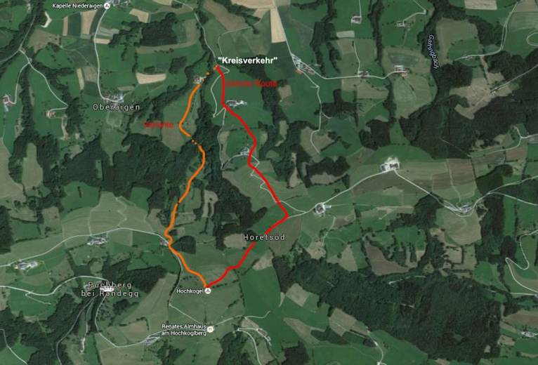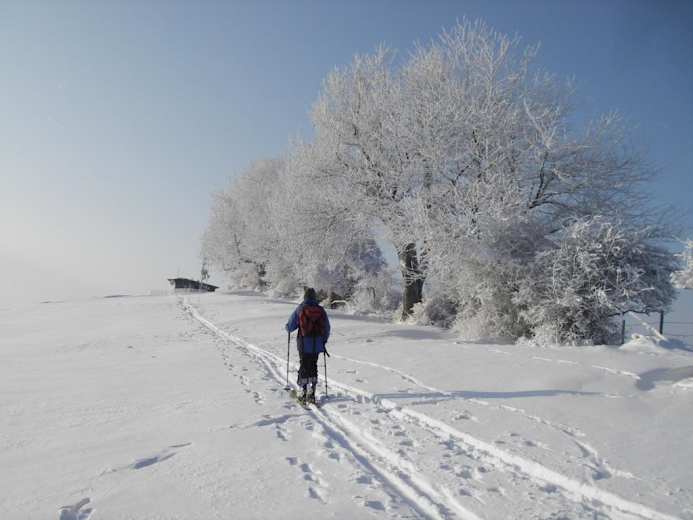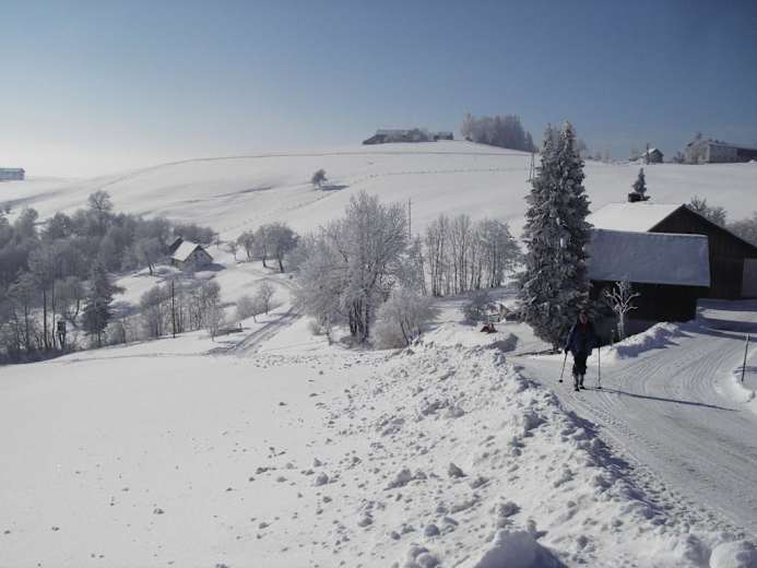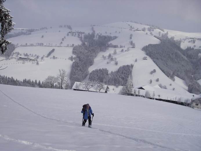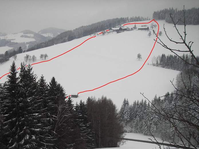 - wir starten Richtung Nordwesten. Beim ersten Bauernhaus (rechts Wildgehege) nahe vom Wildzaun gerade hinunter auf freie Almwiesen. Etwaige Weidezäune werden im Winter meist offen gehalten. Am Ende der freien Wiesen links auf einem Weg durch einen Graben auf eine freie Wiese. Auf dieser hinab zum Gehöft Grub und auf der Straße zum Parkplatz.