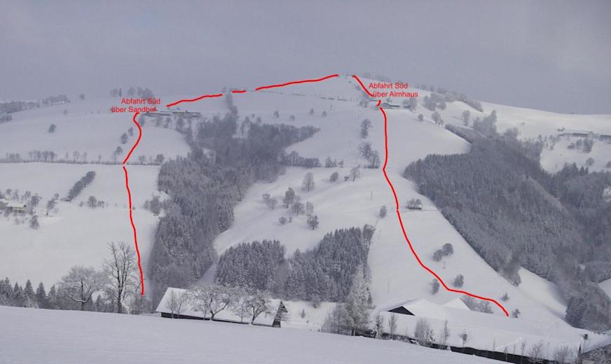 - die Abfahrt am Kamm Richtung Westen beginnen, knapp rechts am Bauernhof Sandhof vorbei, dann gerade hinunter bis einer Kapelle am Schliefaubach. Wenn der Aufstieg zum Tatzberg angehängt wird, neben der Straße 500 m bachabwärts zu einer Brücke.