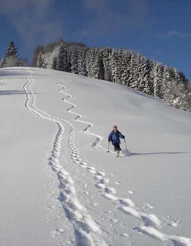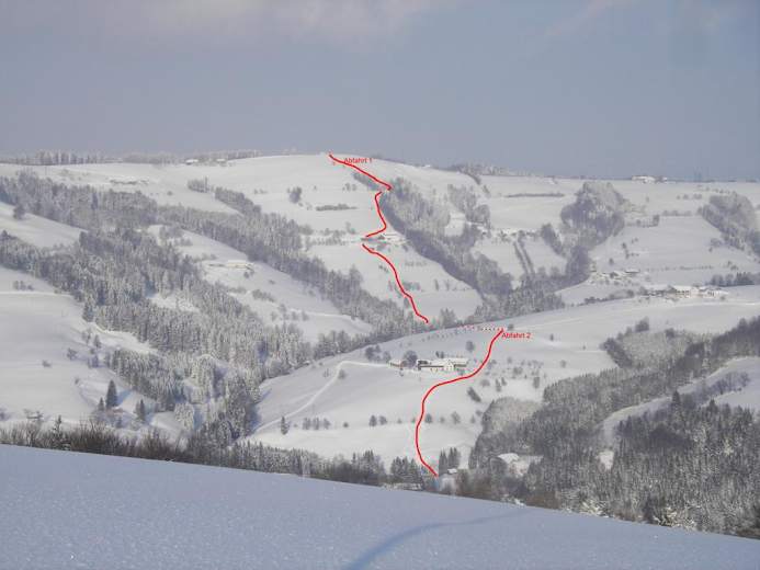 Hier abfellen und links von Hochspannungsmast abfahren, bis ein Weg am Waldrand nach rechts leitet. Bei einem Bauernhauses links oder rechts vorbei und weiter auf schönen Wiesen bis zum Luegbach abfahren. Die gegenüberliegende Forststraße etwa 100 Höhenmeter hinauf bis zu einer Linkskehre (Schi tragen). Nun kurze Abfahrt bis zum Stritzlödbach.