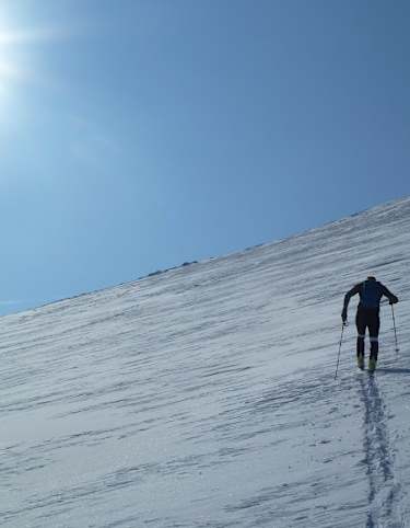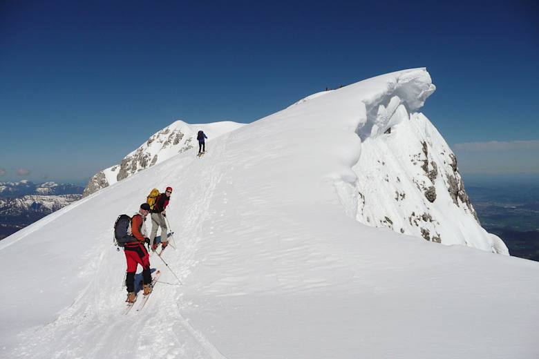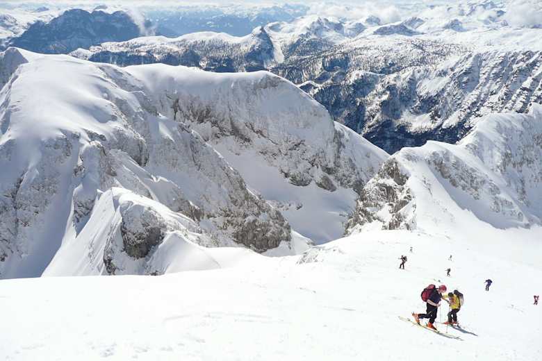 Die ideale Spur führt hier in enger werdenden Kehren die Mulde aufwärts, ehe man unterhalb einer Felsstufe nach Osten auf den Rücken hinausquert, um oberhalb der Felsen zum sogenannten Kuchler-Kreuz zurück zu queren. Hier befindet sich die Einfahrt in die Göll-Ostwand, eine Steilwandabfahrt, die den Spezialisten vorbehalten ist. Mit großem Sicherheitsabstand zu den in der Regel gut erkennbaren, mächtigen Wechten oberhalb der Wand, quert man auf der Westseite (oft abgeblasen über apere Stellen) direkt auf den kurzen Gipfelhang des Hohen Gölls zu. Diesen überwindet man in 4-5 Kehren, ebenfalls mit Respektabstand zum Ostwandabbruch und steht nach 5 min am höchsten Punkt.