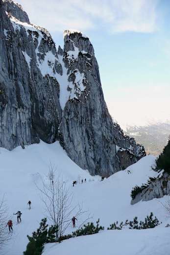 Durch lichten Wald geht es hinauf zu einem kurzen Hang unterhalb einer weiteren, ungesicherten Felsstufe. Diese kann bei guter Schneelage, zwar anspruchsvoll, auf Fellen bewältigt werden. Meist ist aber auch diese Passage hart ausgefahren und in leichter Kletterei (Schwierigkeit I) über mehr oder weniger vereisten Felsen bzw. harten Schnee mit unterschiedlich guten Tritten ohne vorhandene Sicherungsseile zu bewältigen. Am besten überwindet man die Stelle im Sinne des Aufstieges etwas nach rechts um dann nach links in eine kleine Mulde oberhalb aufzusteigen. Hier können bei guter Schneelage und Spur die Skier wieder angeschnallt werden. Die ideale Spur verläuft nun weiter eher im linken Teil zwischen den Bäumen aufwärts. Meist sind hier Harscheisen unentbehrlich!