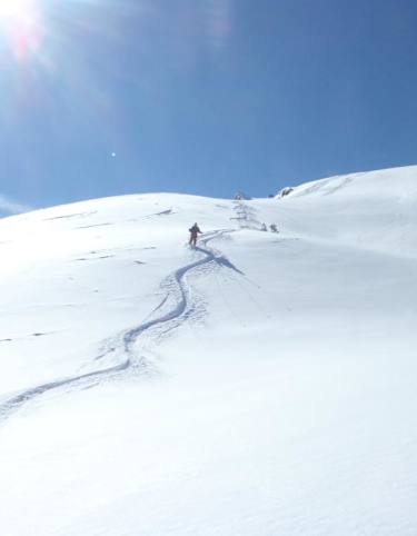 Für ehrgeizige und noch nicht ausgelastete Höhenmetersammler bietet sich bei der Abfahrt ein Abstecher auf das Hohe Brett an. Nach dem langen Flachstück aus den Umgängen mit der einen oder anderen Gegensteigung fellt man vor der weiteren Abfahrt in das steile Alpeltal auf ca. 2.000 m Höhe noch einmal an. Der Anstieg auf das Hohe Brett ist bei günstigen Verhältnissen oft gespurt und vom Anfellplatz aus gut einzusehen. Über flaches Gelände zieht man die Spur in Richtung Süden an den Beginn der breiten, steilen Rinne, welche bis in den Gipfelbereich des Hohen Bretts führt. Am besten spurt man etwas rechts im Sinne des Aufstiegs an. In einigen Spitzkehren erreicht man nach ca. 200 Hm wieder flacheres, gegliedertes Gelände und steigt in idealer Spuranlage, oft zwischen abgeblasenen Kuppen direkt auf den Brettgipfel zu. Abfahrt wie Anstieg! In der nordseitig exponierten Rinne liegt oft auch im Frühjahr noch guter Pulverschnee, jedoch sollte man aufgrund der Steilheit (+30-35 Grad) die Lawinengefahr sehr kritisch beurteilen. Der obere Teil wird gerade bei oder nach Föhnwetterlagen von Süden aber auch generell bei Westwetterlage seitlich eingeblasen.