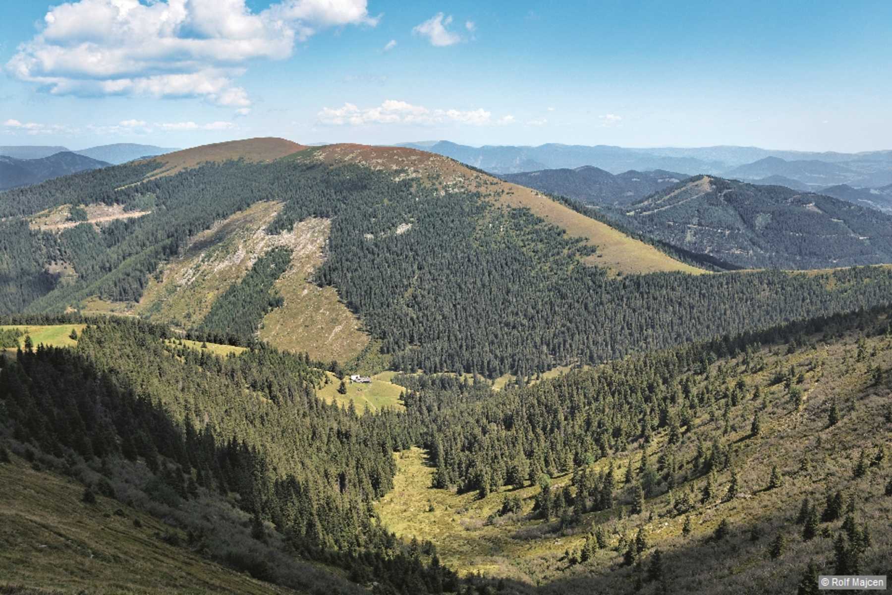 Die höchsten Erhebungen der Gleinalpe präsentieren sich als baumfreie Rundgipfel ohne felsige Gipfelformationen. Ihre breiten Kuppen gehen nahtlos in lang gestreckte Bergrücken über, die durch tiefer liegende sanfte Sättel unterbrochen werden. Oberhalb der Baumgrenze hat die Natur ein großartiges Mosaik aus Zwergstrauchheide, alpinen Gräsern, saftigen Almen, Weiderasen und kristallinem Gestein geschaffen, das – mal mehr, mal weniger – wie Streuselzucker auf einem Brioche-Striezel die Oberfläche ziert. All das vermittelt dem Betrachter ein Gefühl von großer Weite und Harmonie. Bei unserer Wanderung in diesem ruhigen Kuppengebirge nähern wir uns den höchsten Erhebungen der Gleinalpe von Nordwesten aus dem Weitental und besteigen zuerst den Eiblkogel. Von dort verläuft die herrliche Kammwanderung durch etwas Blockgestein zum Kreuzsattel und aus diesem, völlig konträr zu den Steinplatten beim Abstieg vom Eiblkogel, über saftige, beweidete Wiesen bis zum Lärchkogel. Auf dem ungemein aussichtsreichen Weg begeistert auch die Lage der idyllischen Zechneralm, die wir schon beim Abstieg vom Eiblkogel erblicken und zu der wir vom Lärchkogel absteigen.
