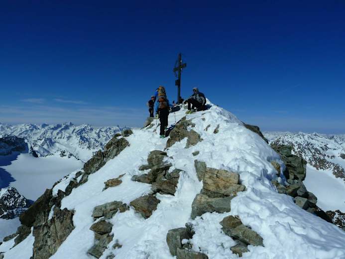 Vom Skidepot geht es in nordöstlicher Richtung über anspruchsvoll überden teilweise ausgesetzten Grat in ca. 1 Stunde Gipfel der Ruderhofspitze 3.474 m. Bis auf den Gipfelgrat eine wenig schwierige aber auf Grund ihrer Strecke anspruchsvolle Skitour. Nicht für Snowboarder geeignet. (Flats)