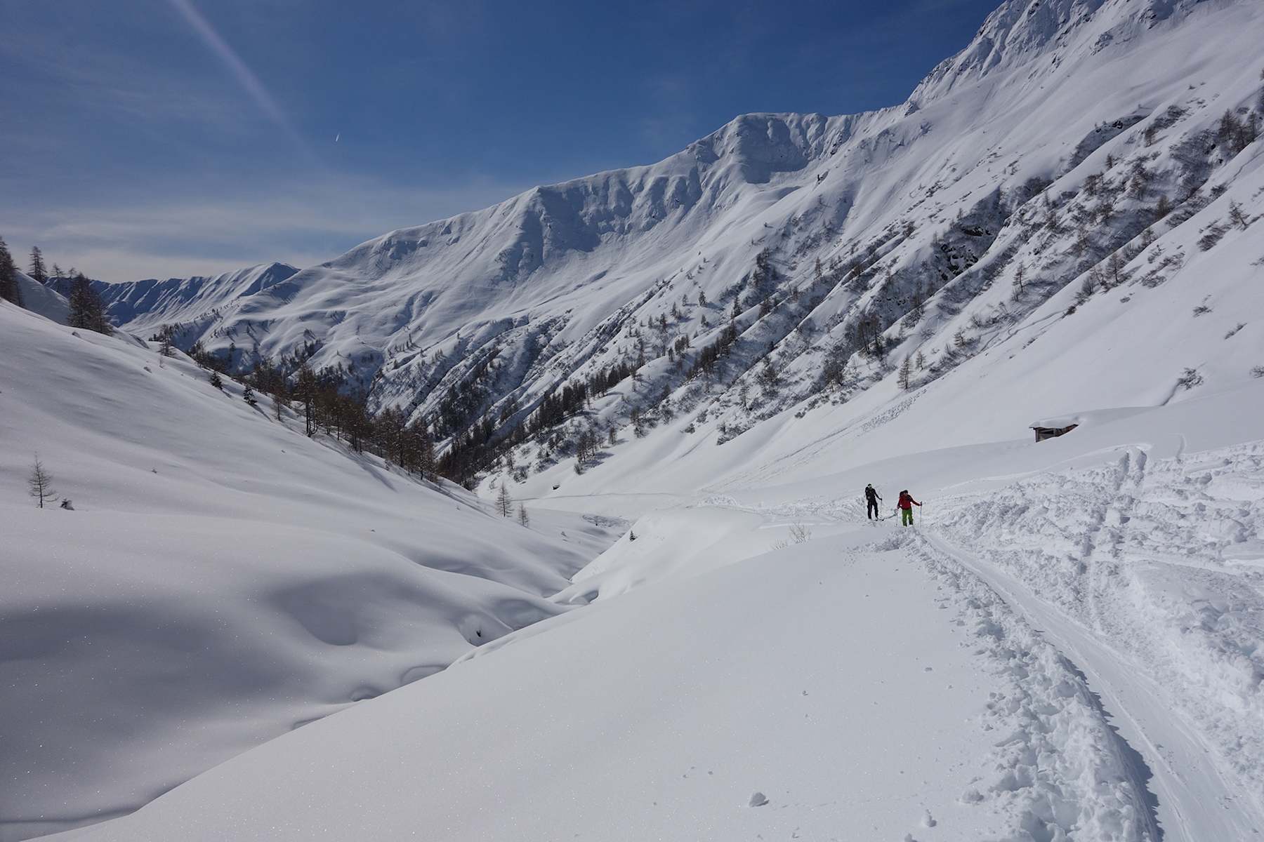 Abfahrt wie Aufstieg. Einkehrmöglichkeit direkt am Ausgangspunkt der Skitour in der Badl-Alm.