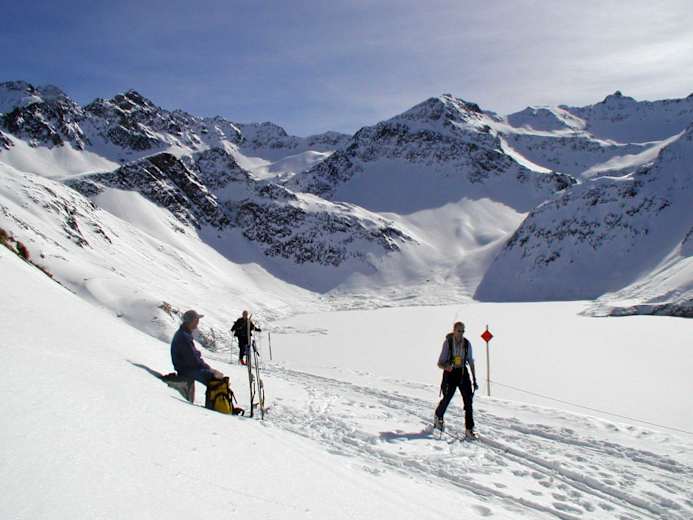 Herrliche Tiefblicke auf den Speicher Finstertal mit der dahinter liegenden Ortschaft Kühtai. Die Tour lässt sich auch optimal mit einem weiteren Anstieg auf die Kraspesspitze verbinden.