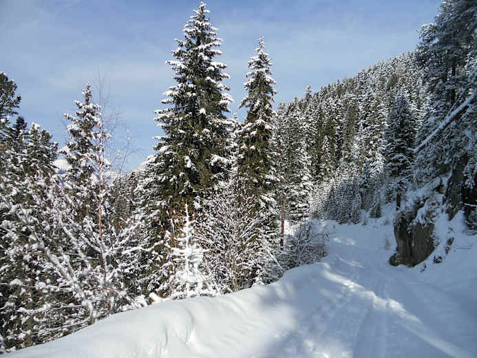Die lohnende Abfahrt führt durch das Brendlkar links oberhalb des Sees vorbei und neben einem Bachgraben zur Loipe. Es folgt ein kurzer Anstieg (ca. 15 min) Richtung Igelsee und hinunter zur Ehrwalder Alm.