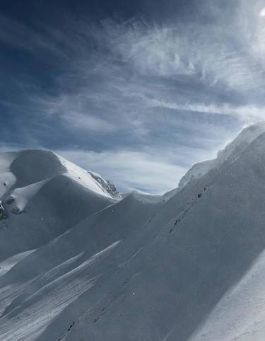 Von dort folgt man dem Grat in südöstlicher Richtung für etwa 500 Meter bis zum Monte delle Rezze. Hier bieten sich mehrere Möglichkeiten an, in das Tal zwischen dem Morteir-Gipfel im Norden und dem Monte delle Rezze im Süden zu kommen. Diese Pulverhänge lassen jedes Herz von Tiefschnee-Fans höher schlagen. Ideal ist, wenn man den Drop In schon beim Aufstieg anschaut, damit man sich einen Überblick über Wechten und Verfrachtungen machen kann.