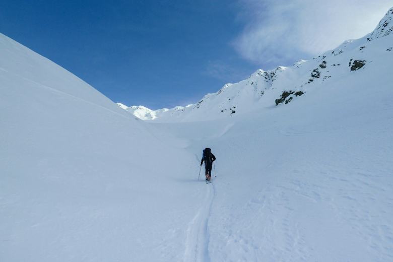 Man nimmt den Gipfel mit und fährt hierauf bis in den hintersten Talboden ab, wo man sein zweites Nachtlager verrichtet (ca. 1.650 m).