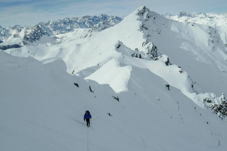 Von der Steinkarspitze fährt man über genussvolle Hänge bis zu den Luggauer Böden auf Höhe von ca. 2.100 m ab. Man fellt auf und ersteigt hierauf das Luggauer Törl (2.232 m).