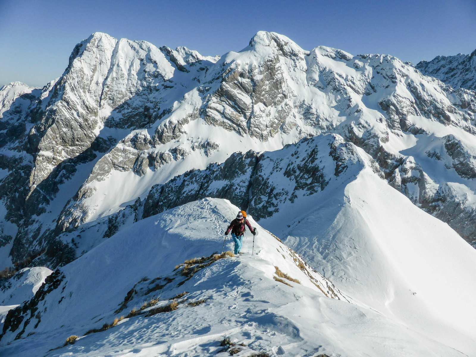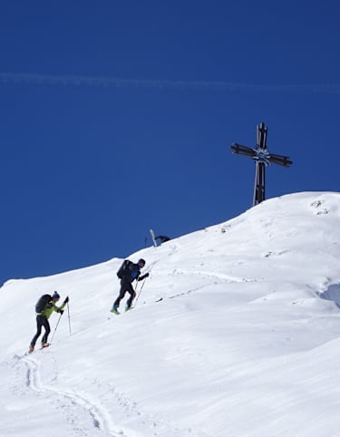 Über die kurze aber steile Südflanke geht’s bis zum höchsten Punkt - bei wenig Schnee befindet sich ein Skidepot knapp unterhalb des Gipfels!