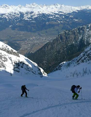 Nun erreicht man mittels einer Linkstraverse ein schönes nordostseitiges Kar. Man folgt diesem, eine erste Steilstufe zentral oder rechts umgehend, eine zweite steilere Stufe direkt überwindend, bis in einen Sattel südlich des Gipfels.