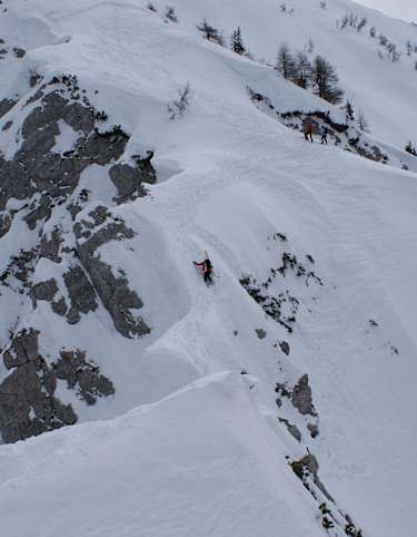 Man steuert über freie, mit Latschen garnierte Hänge, eine steile Rinne an, die dann in eine Scharte mit einem kleinen Bäumchen geleitet (Steigeisen bei Hartschnee!), von wo aus man leicht absteigend ins jenseitige Kar gelangt. Daraufhin quert man das Kar in westlicher Richtung und hält sich dann abenteuerlich links eines Baches zum Auslauf der Plengesüdflanke, etwas westlich der Raimundaalm.